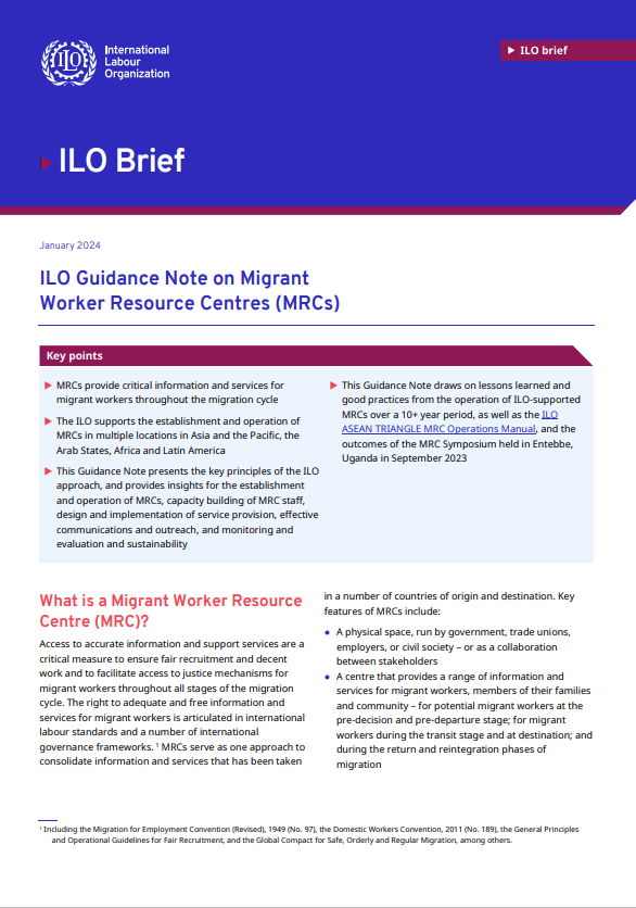 Migrant Worker Resource Centres (MRCs) provide critical information and services for migrant workers throughout the migration cycle. This Guidance Note presents the key pr...