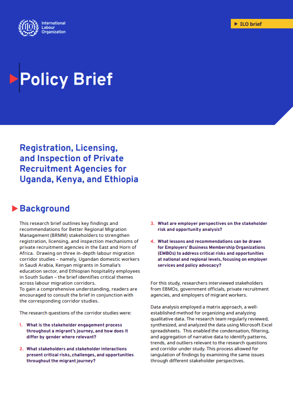 This policy brief examines the registration, licensing, and inspection of private recruitment agencies in Uganda, Kenya, and Ethiopia to improve regional migration managem...